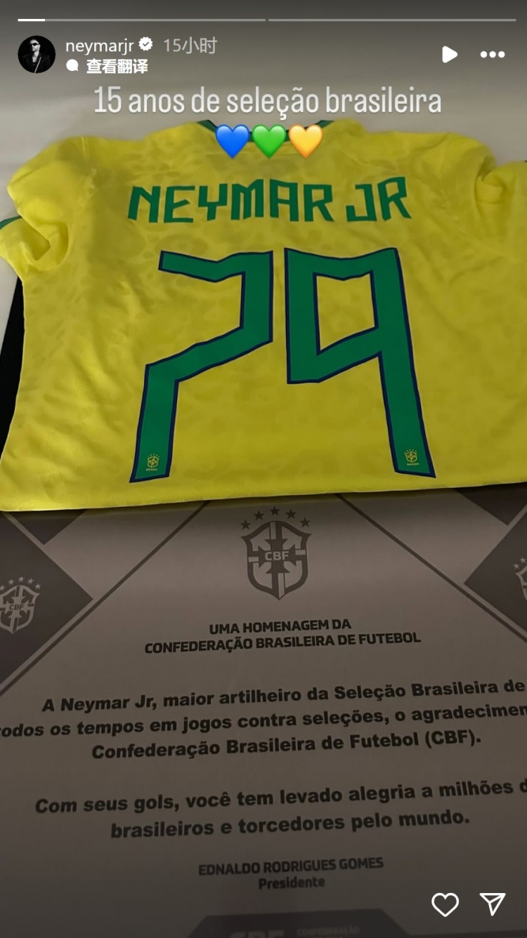 内马尔在社交媒体上展示了印有"79球"字样的纪念球衣和巴西足协颁发的荣誉奖章,并配文写道:"巴西国家队首秀15周年纪念。"